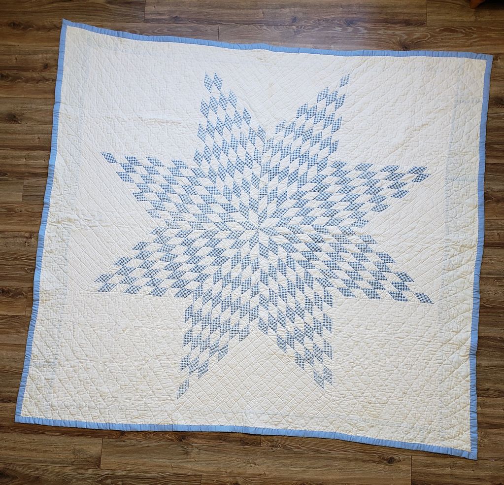 With the permission from the owner of the quilt, I replaced the old binding around the edge of the quilt with brand new blue binding that matched the fabric in the star. The owner and I agreed that this helped the star "pop". I hand sewed the binding on.