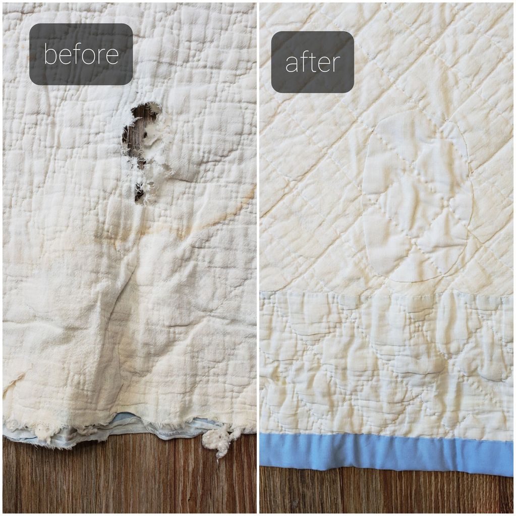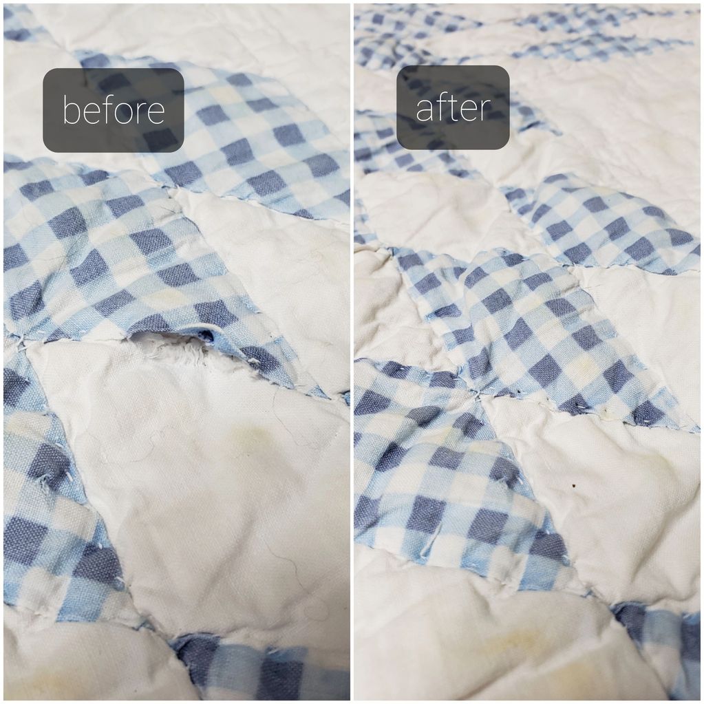 I repaired the large hole by adding some batting to fill the space and interfacing to stabilize the fabric to keep it from fraying. Then I hand sewed a patch over the hole on the front and the back. After the patches were in place, I hand quilted over the patches following the existing quilting so the at patches would blend into the quilt. Can you see the patches?