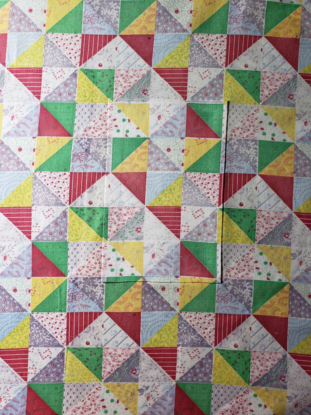 This is a beautiful 1940's half square triangle “cheater” fabric whole cloth quilt. Cheater fabric is fabric designed and printed to look like patchwork or applique and a cheater quilt allows you to skip the huge task of doing piecework on a quilt.