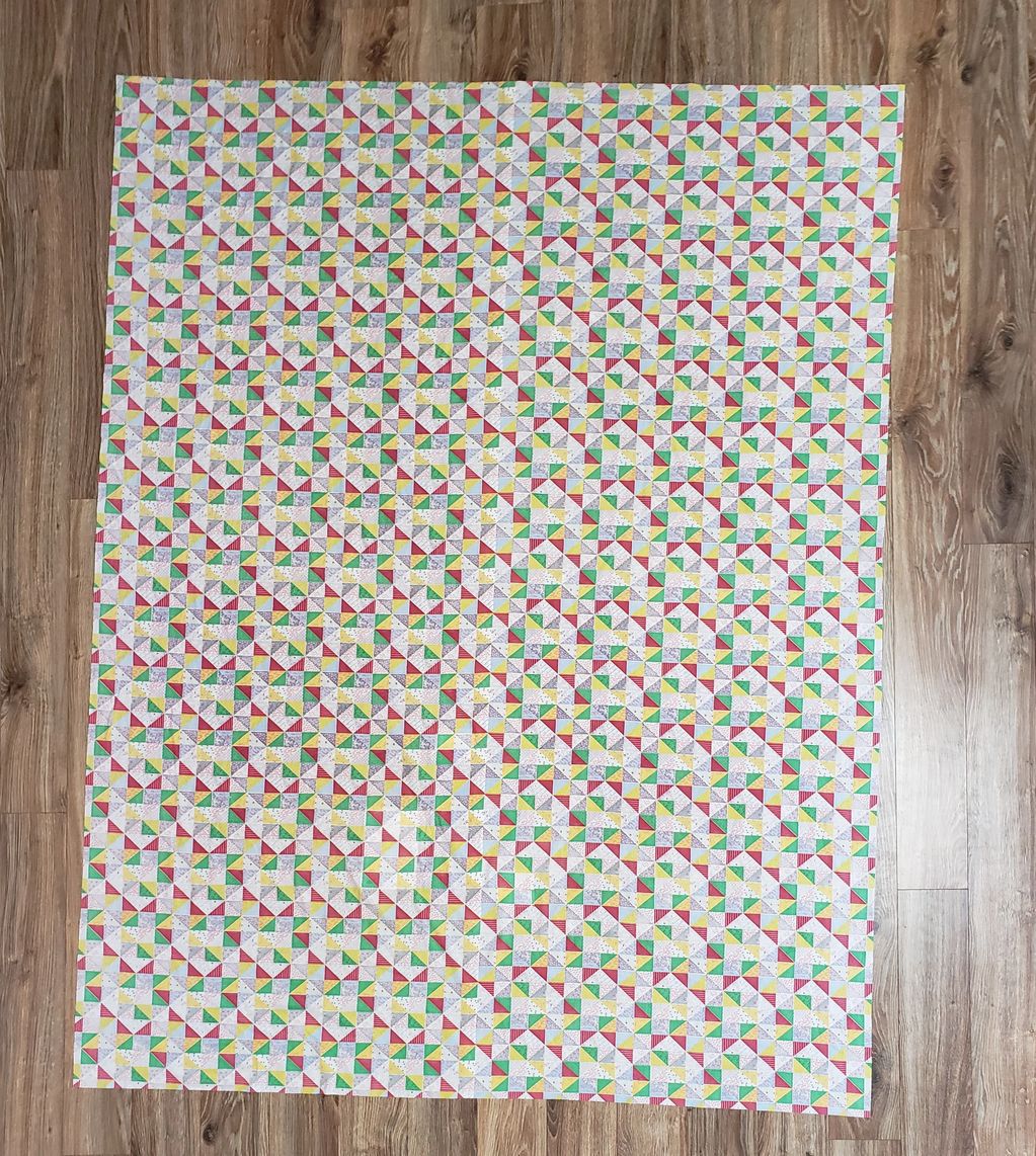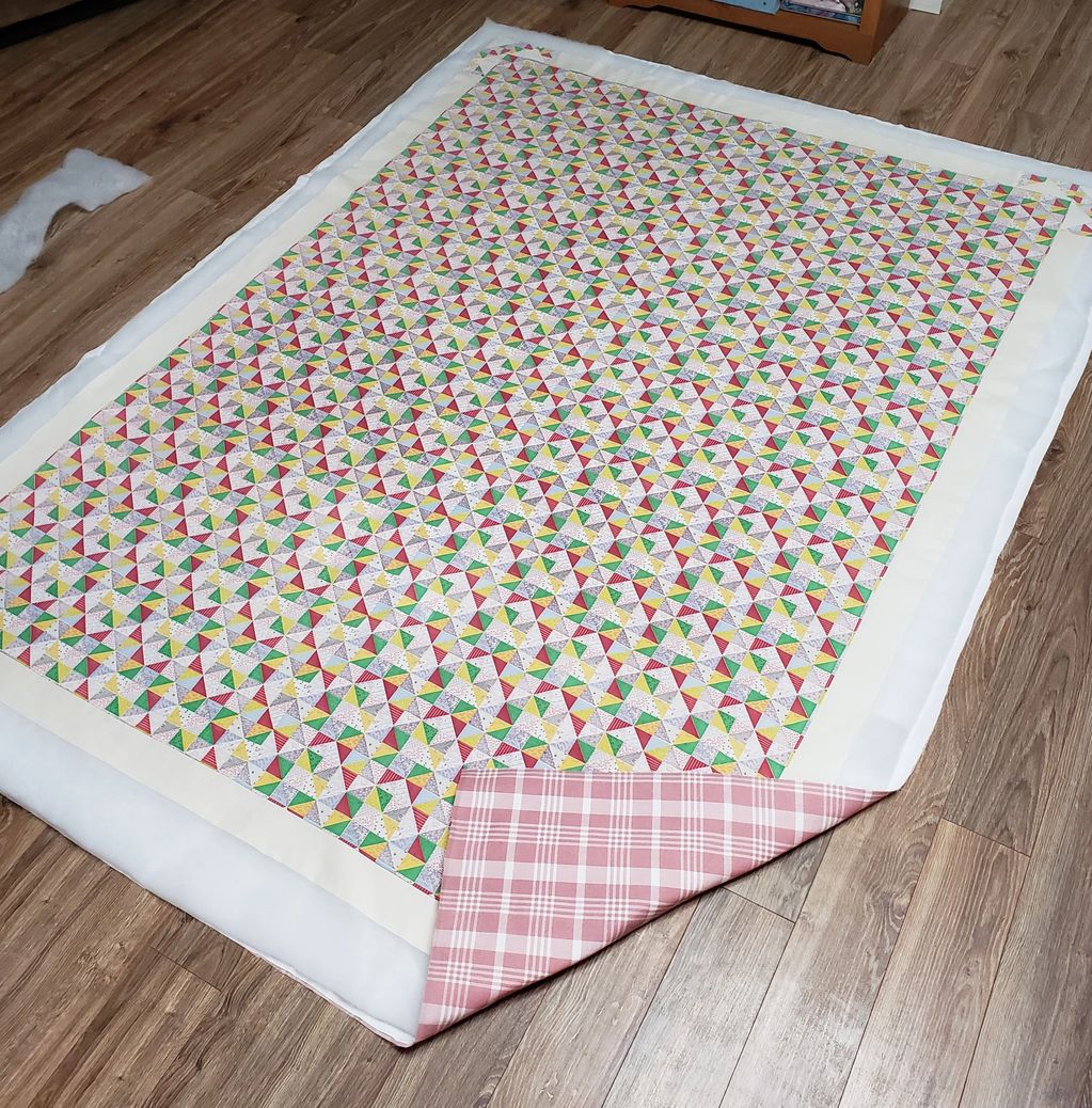 Then I put together the “quilt sandwich”. I added a new plain white sheet to the quilt to add stability to the vintage fabrics. I layered the quilt in this order from top to bottom:
